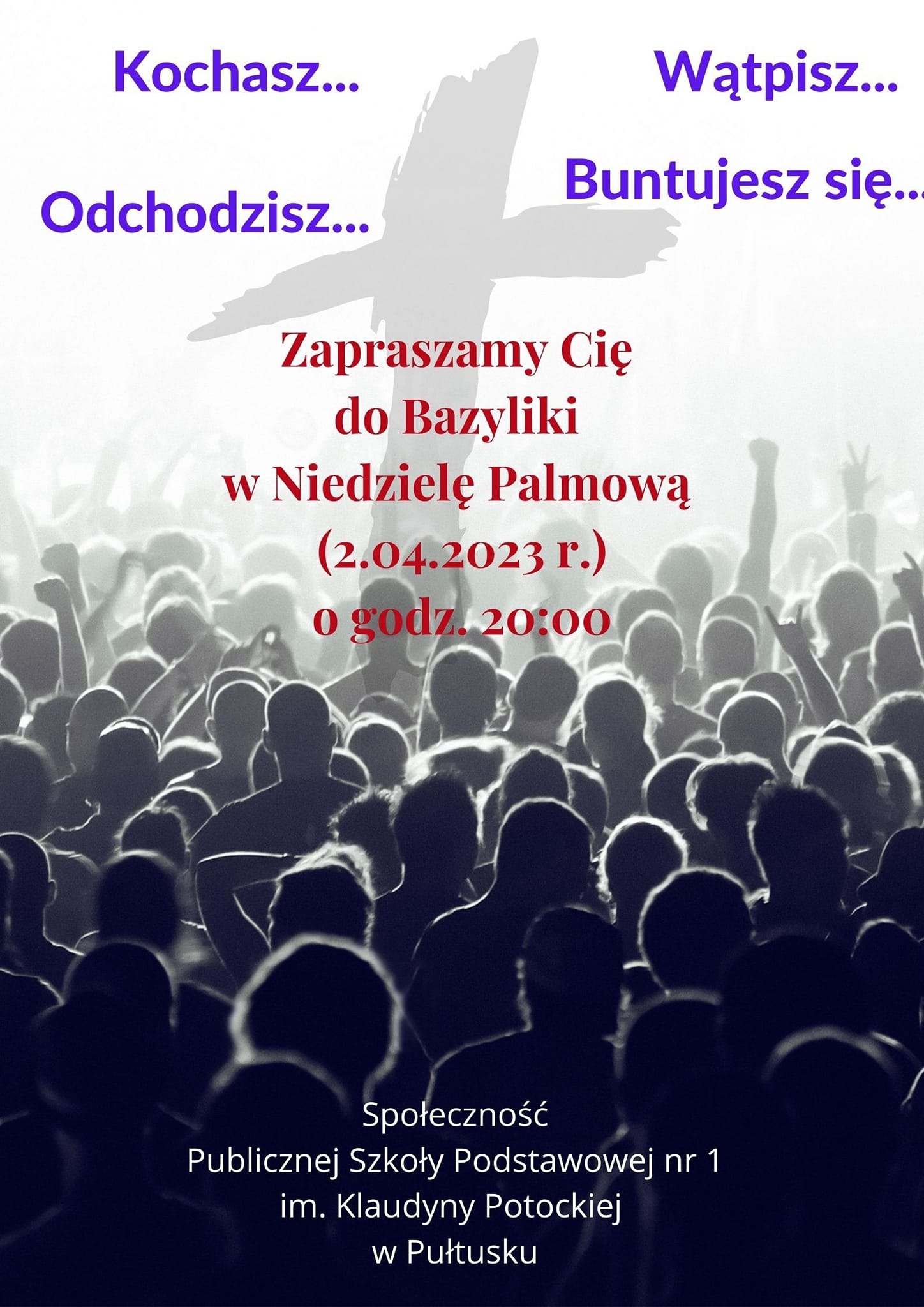Społeczność Szkoły Podstawowej Nr 1 im. Klaudyny Potockiej (uczniowie i ich rodzice, nauczyciele i pracownicy) przygotowali wielkopostny program zatytułowany: "Kochasz, wątpisz, buntujesz się, odchodzisz." Jest to potężne misterium, w którym bierze udział ponad 70 osób. Organizatorzy zapraszają młodzież i dorosłych w najbliższą niedzielę (Niedzielę Palmową) do bazyliki na godz. 20.00 do wspólnego uczestnictwa w tym ogromnym przedsięwzięciu. Mamy nadzieję, że to wydarzenie na długo zapadnie w naszej pamięci i naszych sercach. Czas trwania około 50 minut. Zapraszamy.